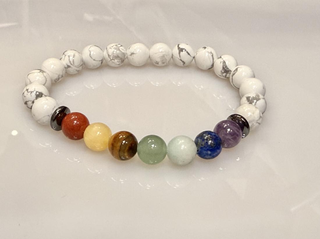 Découvrez le bracelet “Équilibre des Chakras”, un bijou conçu pour harmoniser corps et esprit grâce à la puissance des pierres naturelles. Les sept perles colorées représentent chacun des chakras principaux, favorisant l’énergie, la sérénité et l’alignement intérieur. La howlite blanche, connue pour ses vertus apaisantes, entoure le poignet d’une aura de calme et de clarté.